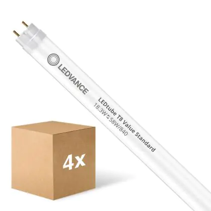 Bei der Mehrfachpackung 10x Ledvance LED Röhre T8 Value (EM/Mains) Standard Output 18.3W 2200lm - 840 | 150cm - Ersatz Für 58W handelt es sich um eine energieeffiziente LED-Röhre. Sie ersetzt Ihre konventionelle Leuchtstoffröhre mit 58W. Die Röhre ist 1514 mm lang und hat die Farbtemperatur 4000K - Kaltweiss. Die durchschnittliche Lebensdauer der LED-Röhre beläuft sich auf 30000 Stunden. Wir bieten Ihnen für dieses Produkt eine Garantie von 5 Jahre an.