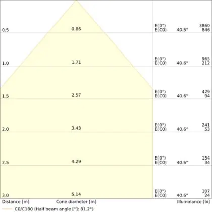 Le code couleur se compose de l'indice de rendu des couleurs (IRC) et de la température de couleur (Kelvin). Le premier chiffre indique le rendu des couleurs (1 = très mauvais rendu des couleurs, 9 = meilleure authenticité des couleurs). Le deuxième et troisième chiffre indiquent la température de la couleur. Exemple : Le code couleur "830" indique que la lampe a un bon rendu des couleurs (8) et une couleur de lumière blanche chaude (30 = 3000K). |
