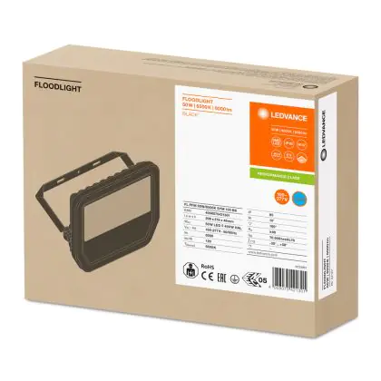 Description Ledvance Projecteur LED GEN 3 Noir 50W 6000lm 100D - 865 | IP65 - Symétrique - Remplacement 100W