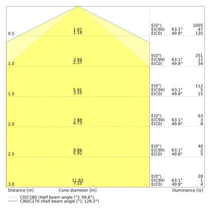 Le code couleur se compose de l'indice de rendu des couleurs (IRC) et de la température de couleur (Kelvin). Le premier chiffre indique le rendu des couleurs (1 = très mauvais rendu des couleurs, 9 = meilleure authenticité des couleurs). Le deuxième et troisième chiffre indiquent la température de la couleur. Exemple : Le code couleur "830" indique que la lampe a un bon rendu des couleurs (8) et une couleur de lumière blanche chaude (30 = 3000K). |