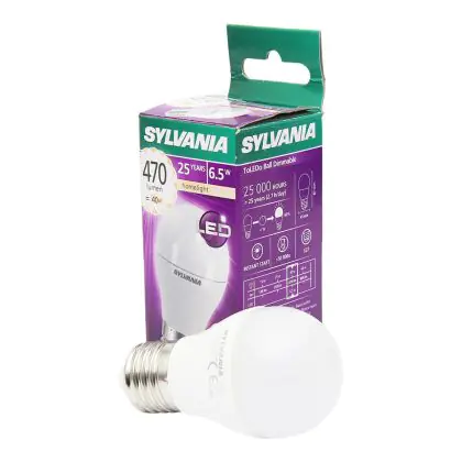 Cette ampoule Sylvania ToLEDo E27 Boule Dépolie 6.5W 470lm - 827 | Remplacement 60W avec son efficacité lumineuse de lumen par watt vous permettra de profiter d’un éclairage de qualité. Avec sa durée de vie de 25000 heures, vous n’aurez pas à vous soucier de son remplacement avant quelques années.